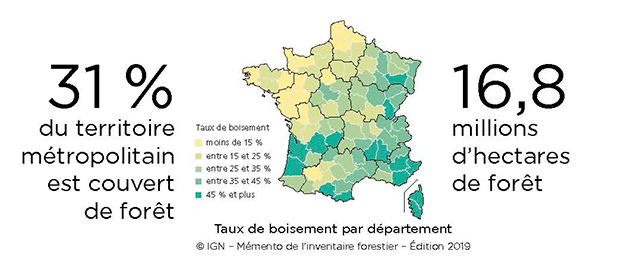 La forêt métropolitaine représente 31% du territoire. Elle est passée de 8.5 millions d’hectares en 1850 à 16.5 millions d’hectares en 2019. Depuis 1985, elle continue de s’accroître à un rythme moyen de 85000 hectares par expansion naturelle, ce qui correspond à plus de 100000 terrains de foot par an.